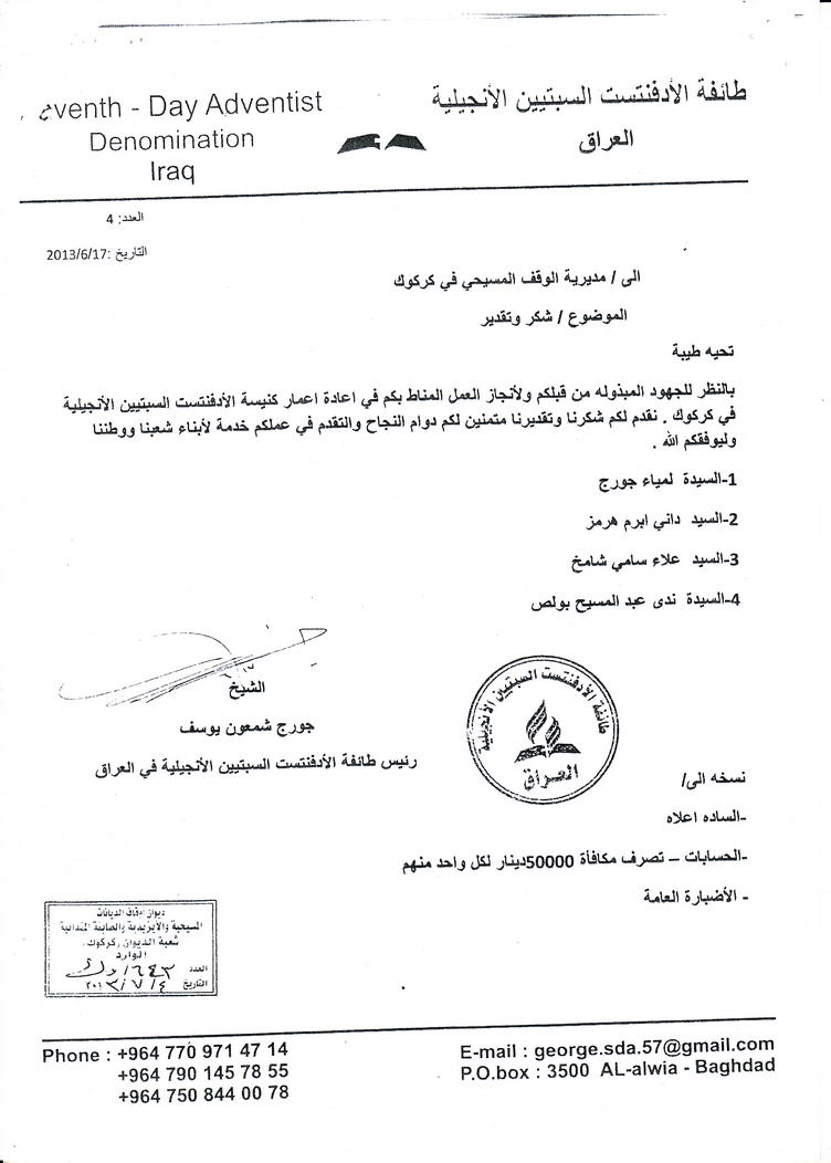 الانجيلية كتاب شكر وتقدير الى اللحنة الهندسية وشعبة كركوك
