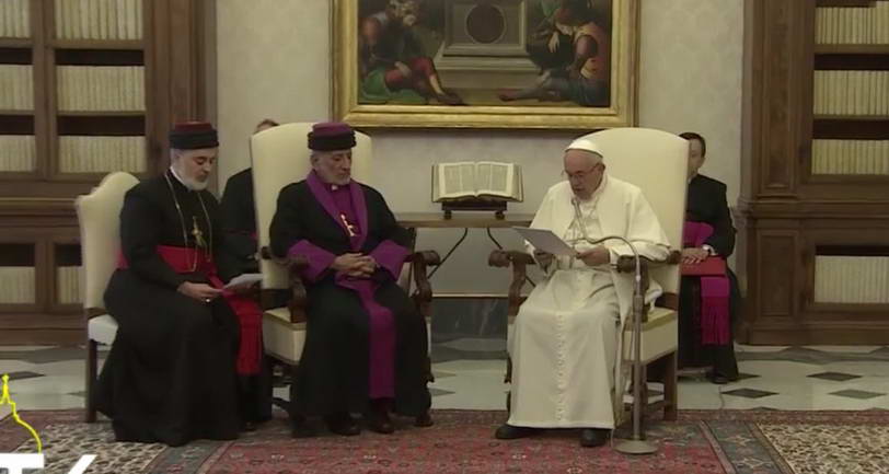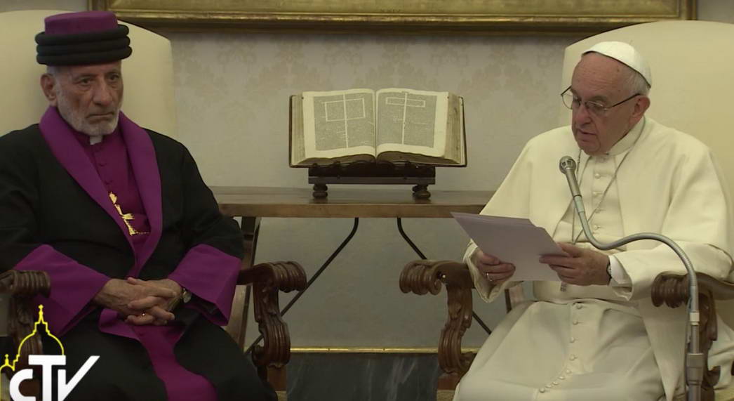 بعدها رفع البابا فرنسيس الشكر لله على العلاقات الأخوية الوطيدة القائمة بين الكنيستين متذكرا لقاءه بالبطريرك الراحل مار دنخا الرابع لسنتين خلتا، والذي كان قد وقع في روما على إعلان مشترك مع البابا الراحل يوحنا بولس الثاني وقد شكلت هذه الوثيقة محطة تاريخية فتحت الباب أمام مسيرة الحج المشتركة نحو الشركة التامة.