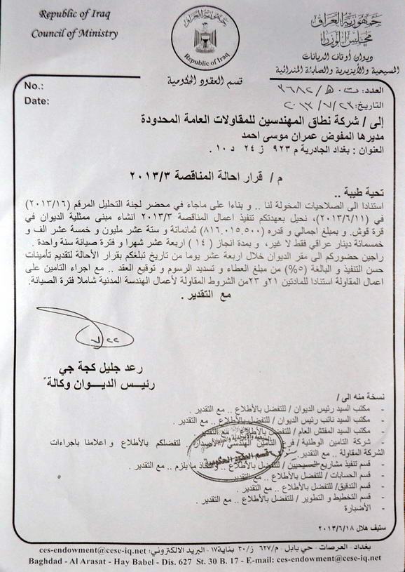1. احالة تنفيذ اعمال المناقصة (5/2013) الخاصة بانشاء بناية