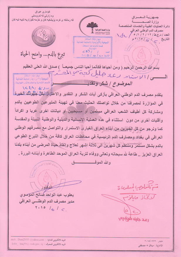 بمبادرة لم تكن الاولى من نوعها قام منتسبو الديوان يوم الاربعاء الموافق 20/5/2015 بحملة التبرع بالدم اسوة بباقي ابناء شعبنا العزيز حيث شارك العشرات من ابناء الديوان يتقدمهم السيد رعد جليل كجه جي رئيس الديوان والمدراء العامين حيث ارادوا ان يشاركوا ولو بدمائهم لدعم ابطالنا في الجيش والحشد الشعبي الذين ينزفون الدماء في سبيل هذا الوطن الغالي من هجمة الشر والتخلف التي تقودها مجموعات داعش الاجرامية.