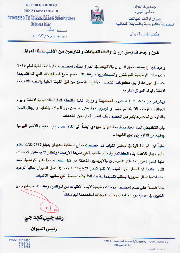 وجود غبن واجحاف بحق الديوان والاقليات في العراق بشأن تخصيصات الموازنة المالية لعام 2015 والدرجات الوظيفية للموظفين والعسكريين، وكذلك حجم ونوع المساعدات التي تم تقديمها بشكل غير عادل بين مكونات الشعب العراقي للنازحين من قبل اللجنة العليا واللجنة التنفيذية لاغاثة وايواء العوائل النازحة.