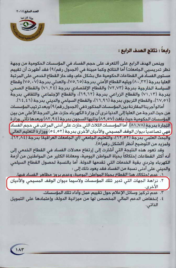 الديانات المسيحية والآيزيدية والصابئة المندائية في المرتبة الاخيرة بحجم الفساد في المؤسسات الحكومية، حيث أشار التقرير الى ان احد اسباب ذلك يعود الى