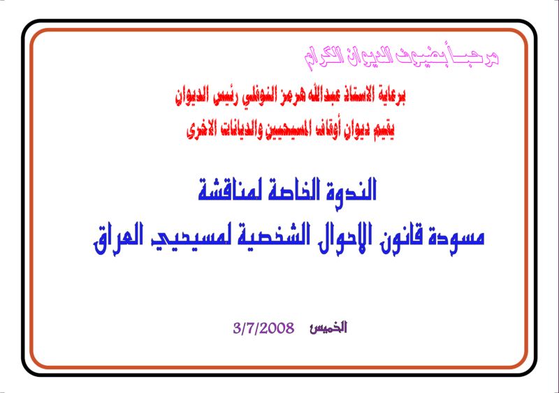 الخميس 3/7/2008 وبرعاية الاستاذ عبدالله النوفلي رئيس الديوان أُقيمت في الديوان ندوة لمناقشة مسودة قانون الاحوال الشخصية لمسيحيي العراق، وقد ترأس لجنة اعداد مسودة القانون المحامي فريد وليم كليانا نائب رئيس الديوان والمحامي سلام ججو ميخا نائب رئيس اللجنة وبعضوية كل من السادة آزاد هرمز نيسان/ المفتش العام، المحامي الفريد سمعان، المحامي حبيب سمعان، المحامي ادسن وليم كليانا والسيد فاضل توما بني. وقد حضر الندوة سيادة المطران شليمون وردوني نيابة عن البطريرك عمانوئيل دلي وعدد من الأباء الكهنة والاخوة والاخوات الافاضل. |