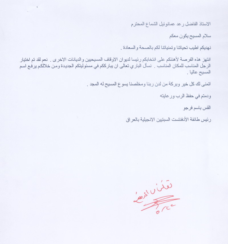 رسائل وبرقيات تهاني وتبريكات الى الأستاذ رعد عمانوئيل الشماع لتسنمه منصب رئيس الديوان