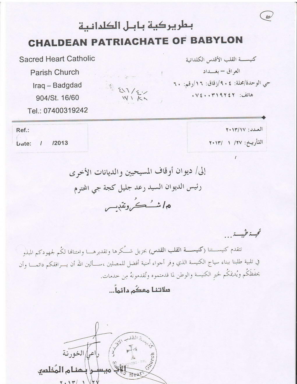 رئيس الديوان يستلم كتاب شكر تثميناً لجهود الديوان المبذولة مع الكوادر العاملة معه لبناء سياج الكنيسة الذي وفر اجواء امنية افضل للمصلين.