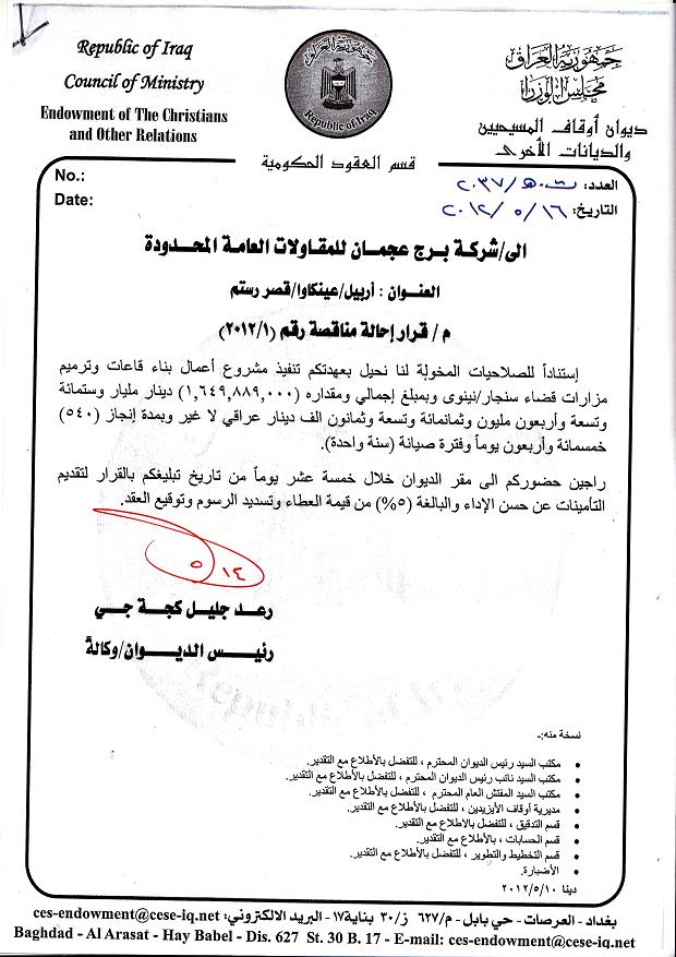 الساند لمعبد لالش /سنجار /نينوى وبمبلغ اجمالي وقدره
