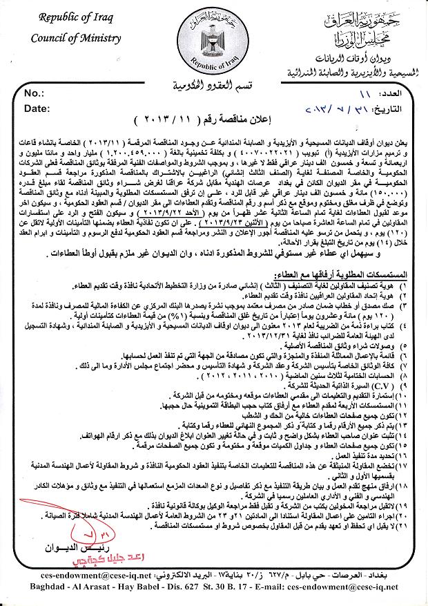 المناقصة الخاصة بتنفيذ اعمال بناء قاعات وترميم مزارات في