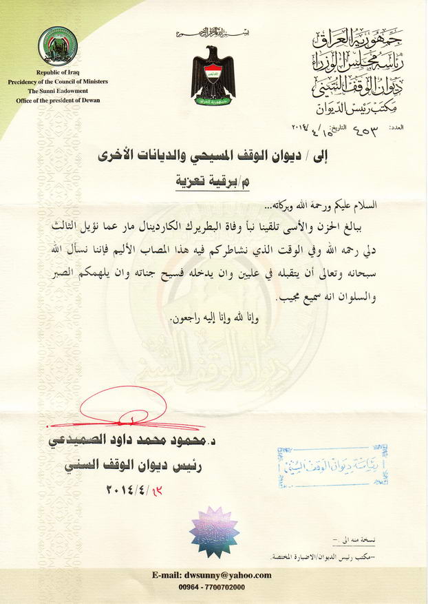 الأربعاء 16 نيسان الجاري وفداً من ديوان الوقف السني ممثَّلاً