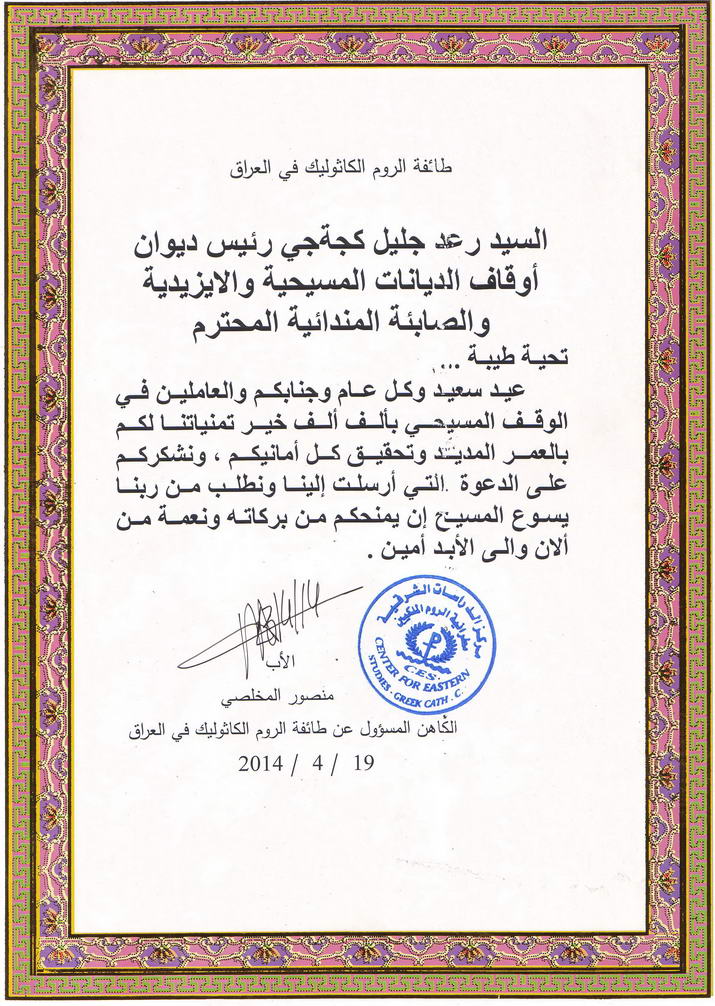 تهنئة من طائفة الروم الكاثوليك في العراق
