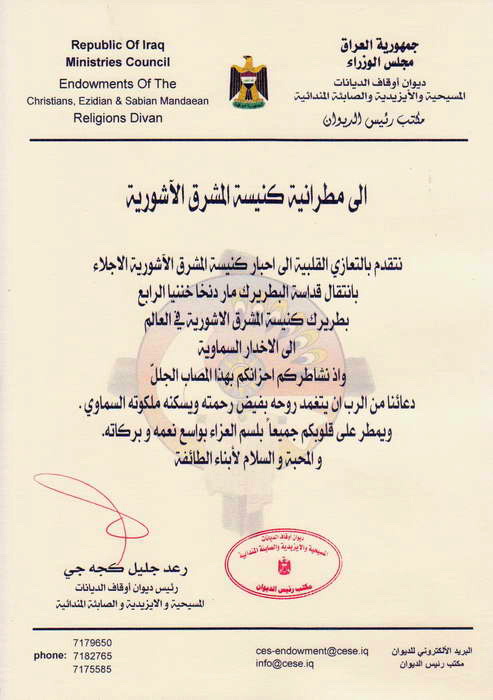 برقية تعزية الى مطرانية كنيسة المشرق الآشورية