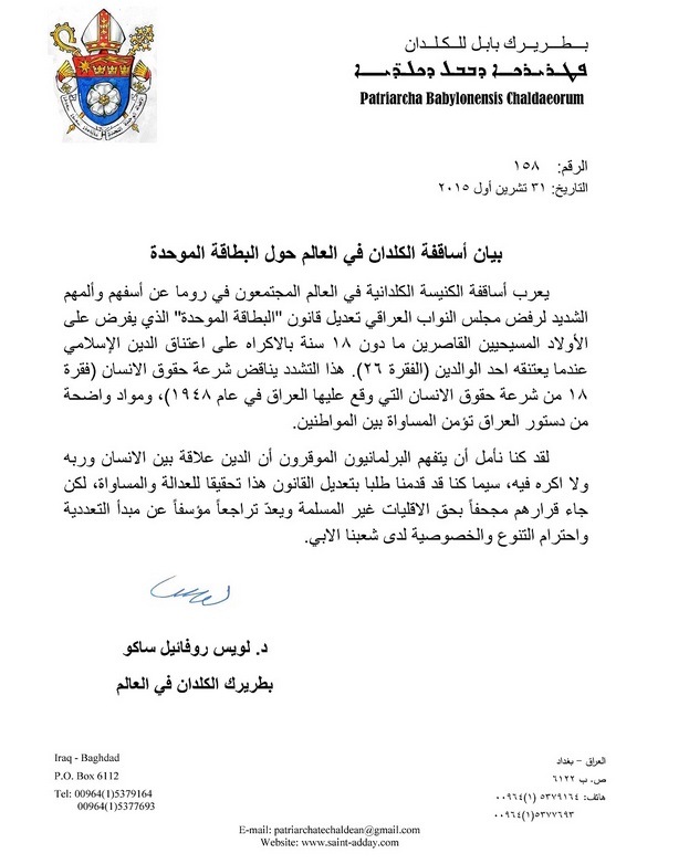 بيان اساقفة الكلدان في العالم حول البطاقة الموحدة