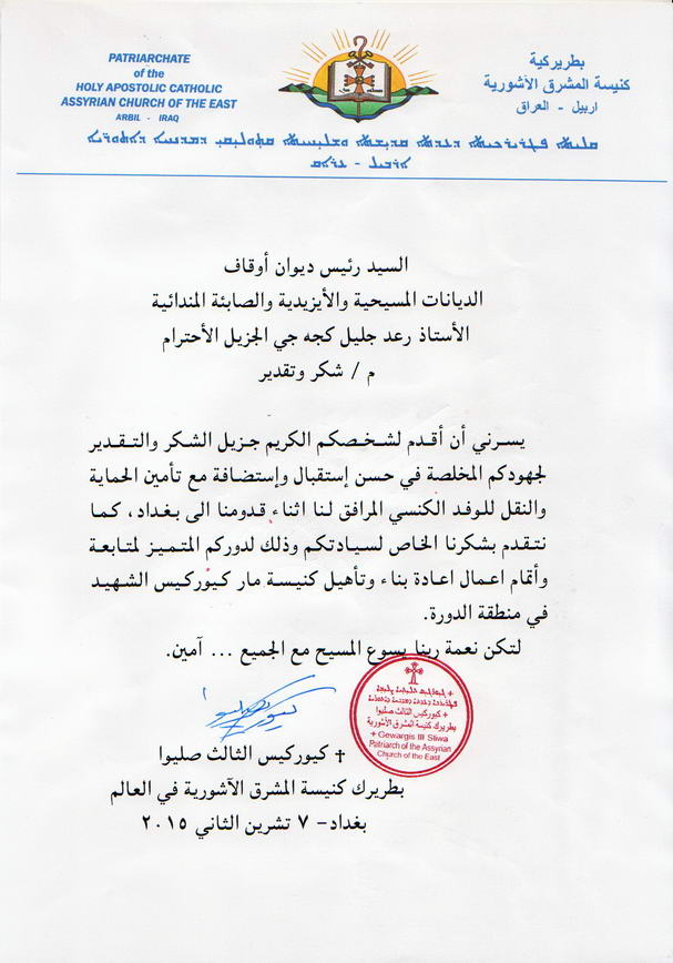 كتاب شكر من بطريركية كنيسة المشرق الآشورية