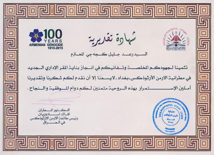 كتابي شكر وشهادة تقديرية من رئيس طائفة الارمن الارثوذكس