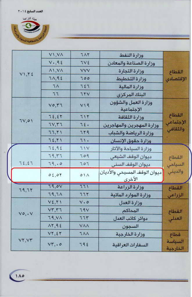 الديانات المسيحية والآيزيدية والصابئة المندائية في المرتبة الاخيرة بحجم الفساد في المؤسسات الحكومية، حيث أشار التقرير الى ان احد اسباب ذلك يعود الى
