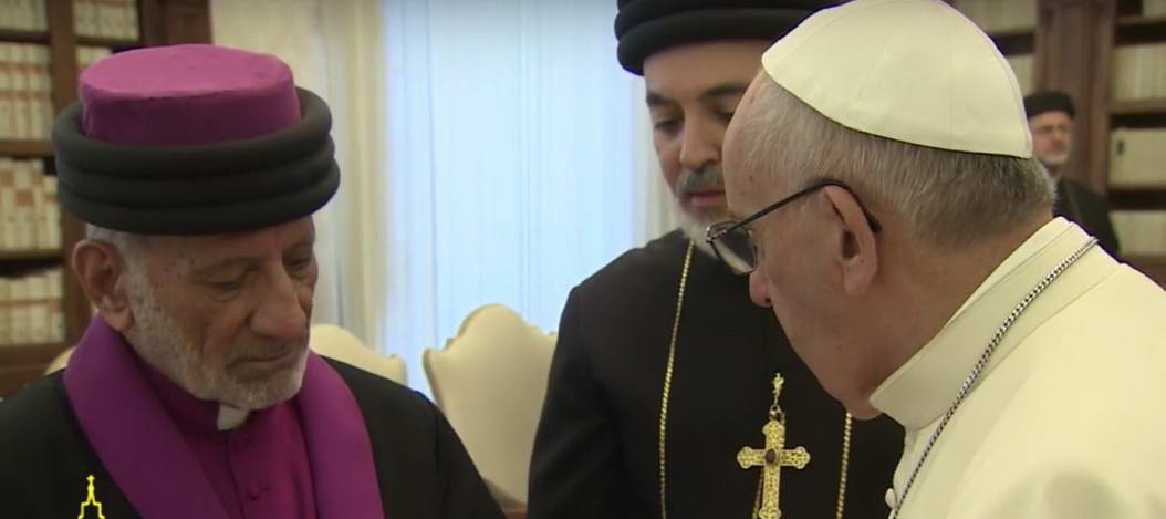 استقبل البابا فرنسيس صباح اليوم الخميس في الفاتيكان بطريرك كنيسة المشرق الآشورية مار كيوركيس الثالث، ووجه له كلمة استهلها معبرا له عن سروره للقائه بالقرب من ضريح القديس بطرس ومحييا أساقفة وكهنة ومؤمني هذه الكنيسة. وأكد البابا أن الكنيستين رفعتا اليوم الصلاة المشتركة إلى الرب من أجل ابتهال عطية السلام، خصوصا إزاء القلق الناجم عن التطورات الراهنة في الشرق الأوسط، لاسيما في كل من سورية والعراق.