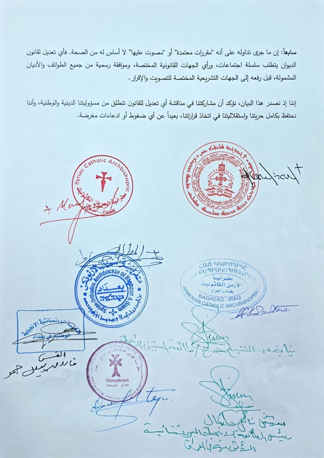 للرأي العام؛ ينشر ديوان اوقاف الديانات المسيحية والايزيدية والصابئة المندائية بيان صادر عن رؤوساء الطوائف المسيحية لما تم ترويجه قبل أيام بخصوص تعديل قانون الديوان.