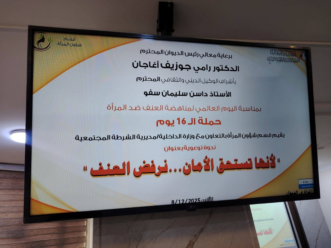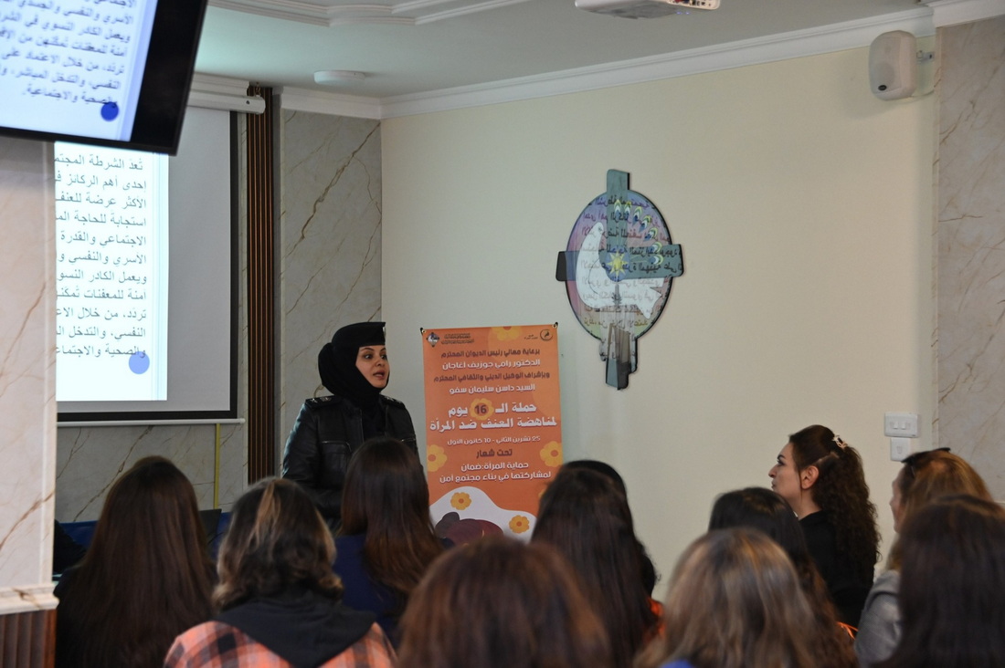 تزامناً مع الحملة العالمية "16 يوماً لمناهضة العنف ضد النساء والفتيات"، أقام قسم شؤون المرأة وفريق المرأة في الديوان بالتعاون مع وزارة الداخلية / مديرية الشرطة المجتمعية، يوم الاثنين الموافق 8 كانون الأول 2025، محاضرة توعوية تحت شعار "لأنها تستحق الأمان.. نرفض العنف".