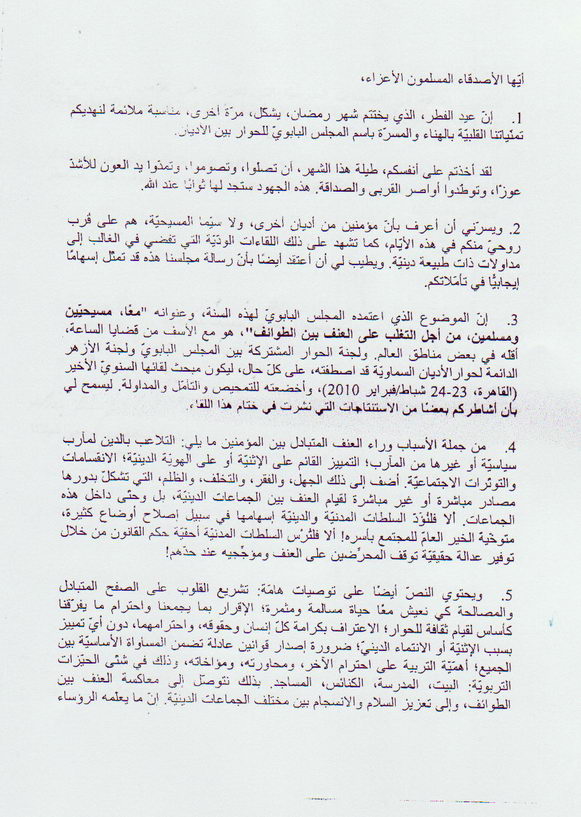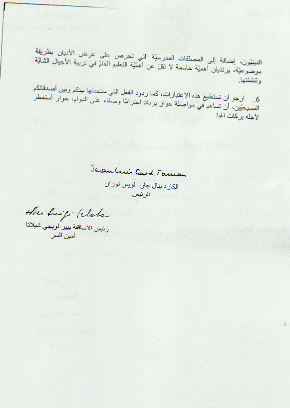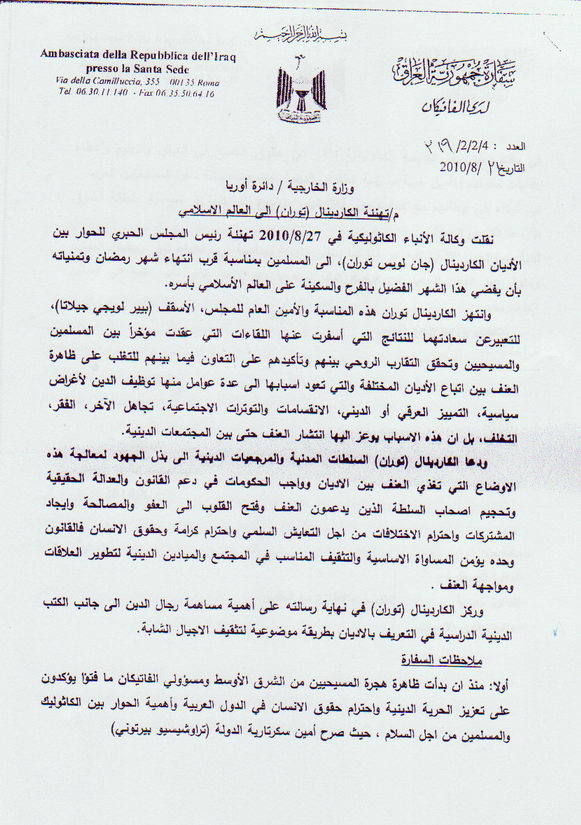 رئيس المجلس الحبري للحوار بين الأديان (الكاردينال جان لويس توران) يهنيء العالم الإسلامي بمناسبة إنتهاء شهر رمضان وحلول عيد الفطر المبارك