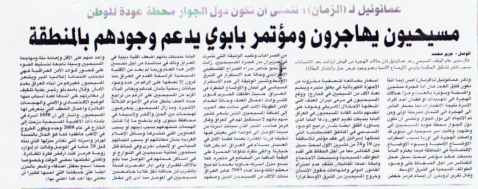 جريدة الزمان: عمانوئيل: نتمنى أن تكون دول الجوار محطة عودة للوطن مسيحيون يهاجرون ومؤتمر بابوي يدعم وجودهم بالمنطقة