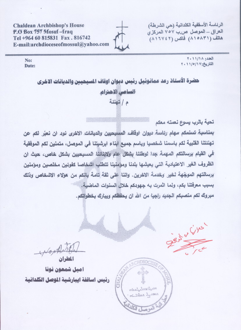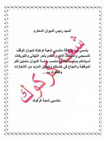 رسائل وبرقيات تهاني وتبريكات الى الأستاذ رعد عمانوئيل الشماع لتسنمه منصب رئيس الديوان