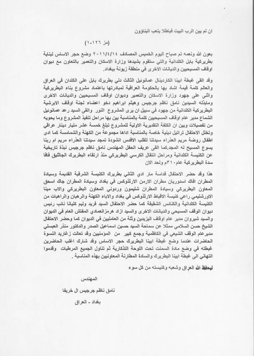 وضع حجر الأساس لبناية بطريركية بابل الكلدانية
