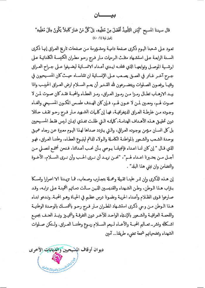 ديوان اوقاف المسيحيين والديانات الأخرى لمناسبة الذكرى السنوية الرابعة لإستشهاد المطران بولص فرج رحو بيــــــان