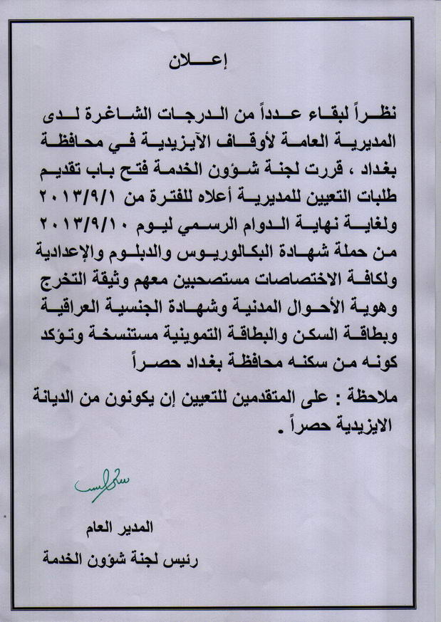 إعــــــــــــــــــــــــــــلان درجات وظيفية شاغرة لدى المديرية العامة لأوقاف الآيزيدية