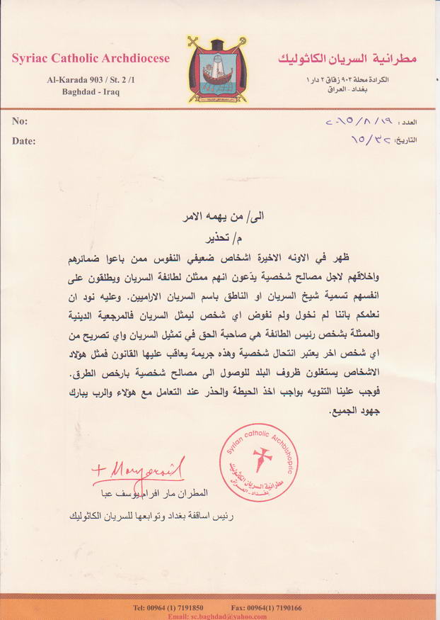 في بيان لها ارسلت نسخة منه الى ديوان اوقاف الديانات المسيحية والايزيدية والصابئة المندائية حذرت مطرانية السريان الكاثوليك تحذر من اشخاص ينتحلون صفة تمثيلهم لطائفة ويطلقون على انفسهم تسمية شيخ السريان او الناطق باسم السريان الاراميين في ادنا نصه:-