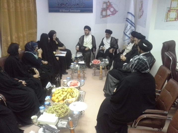 بعد ذلك التقى الوفد السيد جواد الخوئي ومجموعة من اساتذة الحوزة ودار حديث موسع عن المرأة ومعاناتها واضطهادها في المجتمع ووجود ظاهرة خطيرة وهي الحساسية المفرطة في التعامل بين الرجل والمرأة وبالتالي يتطلب الامر الى مشروع يطالب بانصاف المرأة وعدلها وان ذلك يتطلب تثقيف الشعب بكل مكوناته وتنوعه وأكد السيد الخوئي ان السيدة زينب هي خير مثل للمأساة التي عانتها المرأة سابقاً وان مأساة النساء الايزيديات في القرن الحالي يجب ان تجعلنا متماسكين وان تمدنا بالقوة لمواجهة العنف ومناهضته ..