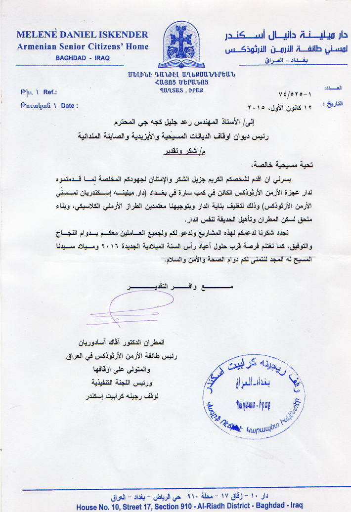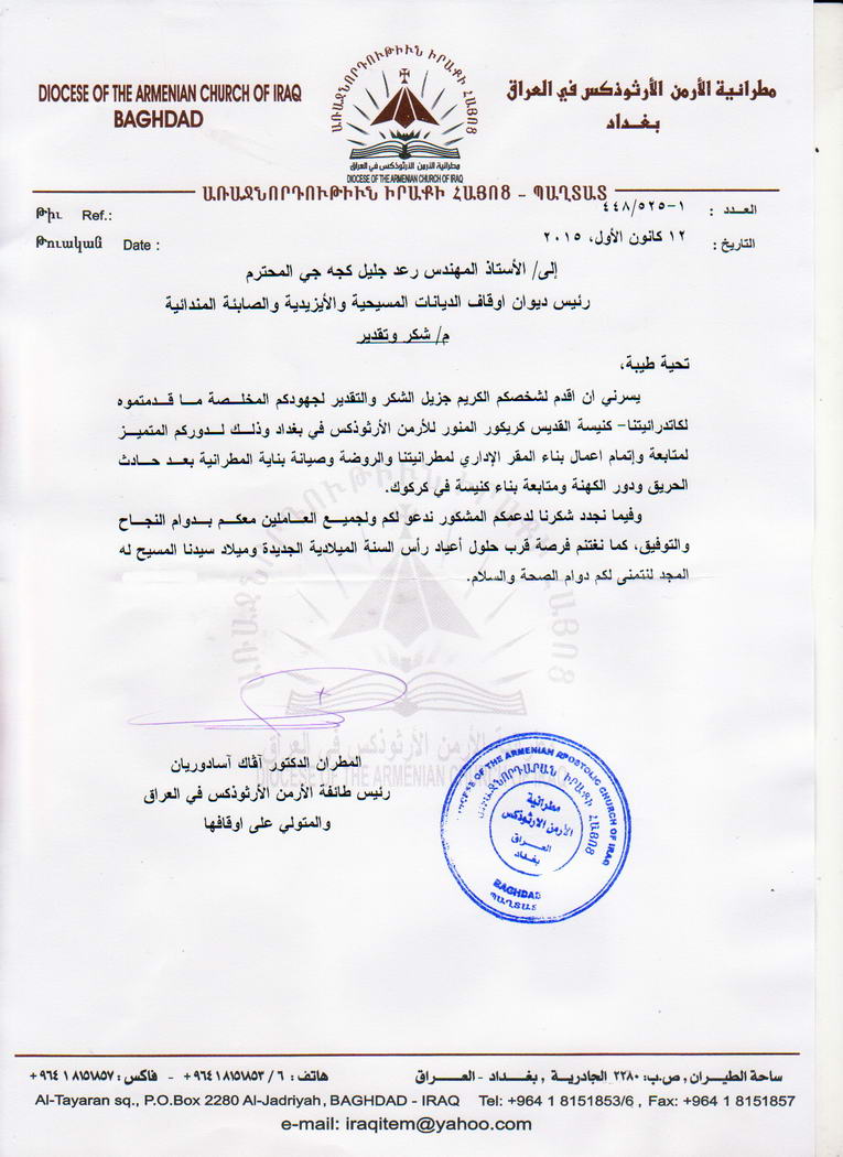 كتابي شكر وشهادة تقديرية من رئيس طائفة الارمن الارثوذكس
