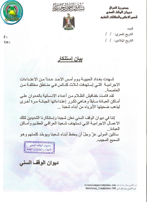 الديوان بيان الإستنكار الصادر من ديوان الوقف السني بشأن