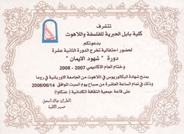 السبت 2008/6/14 أحتفلت كلية بابل الحبرية للفلسفة واللاهوت وبرعاية المطران جاك اسحق عميد الكلية في قاعة جمعية الثقافة الكلدانية (عنكاوا)، بتخرج الدورة الثانية عشرة (دورة شهود الايمان) وختام العام الاكاديمي 2007-2008 بمنح شهادة البكالوريوس في اللاهوت من الجامعة الاوربانية في روما،